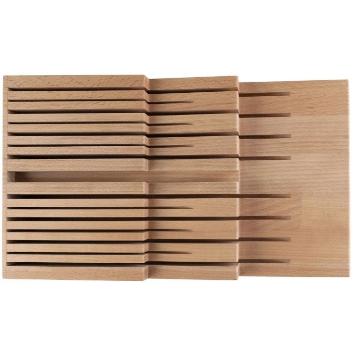 If your kitchen countertop is short on space, or you simply prefer to keep your knives conveniently in a drawer, the Shun 15-Slot In-Drawer Knife Tray is the perfect answer. This in-drawer storage system is made of beautiful beechwood. It has room for up to 14 knives plus 1 slot for your Shun Honing Steel, all in an attractive, durable tray.