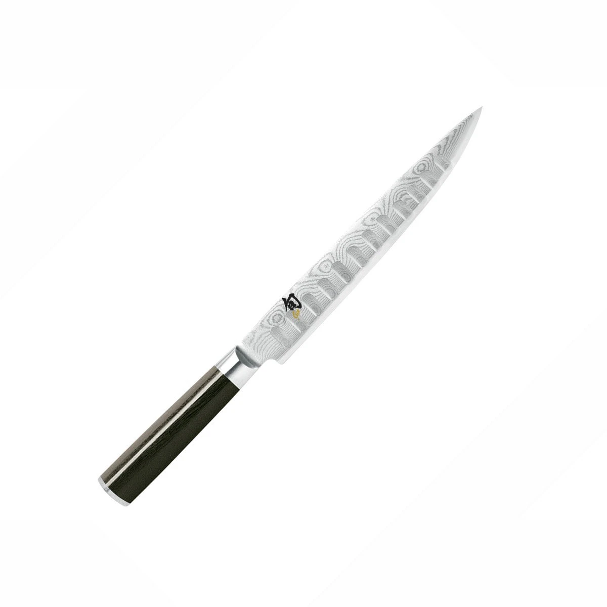 Can the right knife really make food taste better? In a word, yes. The Shun Classic Hollow-Ground Slicing Knife’s long, narrow blade allows you to make a cleaner cut, which helps keep more of the juices—and thus more of the flavor—trapped in the meat. The longer blade lets you make precise slices with a single stroke, while the narrower profile and hollow-ground indentations help the blade glide through the meat with even less friction. Producing thin, beautiful, even slices of meat isn’t hard—when your have the right knife. The Shun Classic Hollow-Ground Slicing Knife is the right knife. The Shun Classic Hollow-Ground Slicing Knife is part of the Shun Classic line of tasteful and contemporary cutlery. The Shun Classic line features beautiful Damascus-clad blades and D-shaped ebony PakkaWood® handles. Yet behind these handcrafted knives’ beauty is function: razor-sharp blades offering top performance. Shun’s proprietary high-performance VG-MAX steel, which provides incredible edge retention, is clad with Damascus stainless steel, then ground and bead-blasted, revealing the flowing pattern of the layered steel. The result is a line of knives that are sharp, durable, and corrosion resistant, as well as beautiful to behold. The Shun Classic line also offers you the widest assortment of both traditional culinary blade shapes and cutting-edge designs, so you can always find the right knife for the task.
