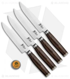 Advance your tableware with a set of steak knives! This set from Shun offers four knives, each with an attractive Pakkawood handle and a hammered, Damascus blade made with a VG-MAX core.